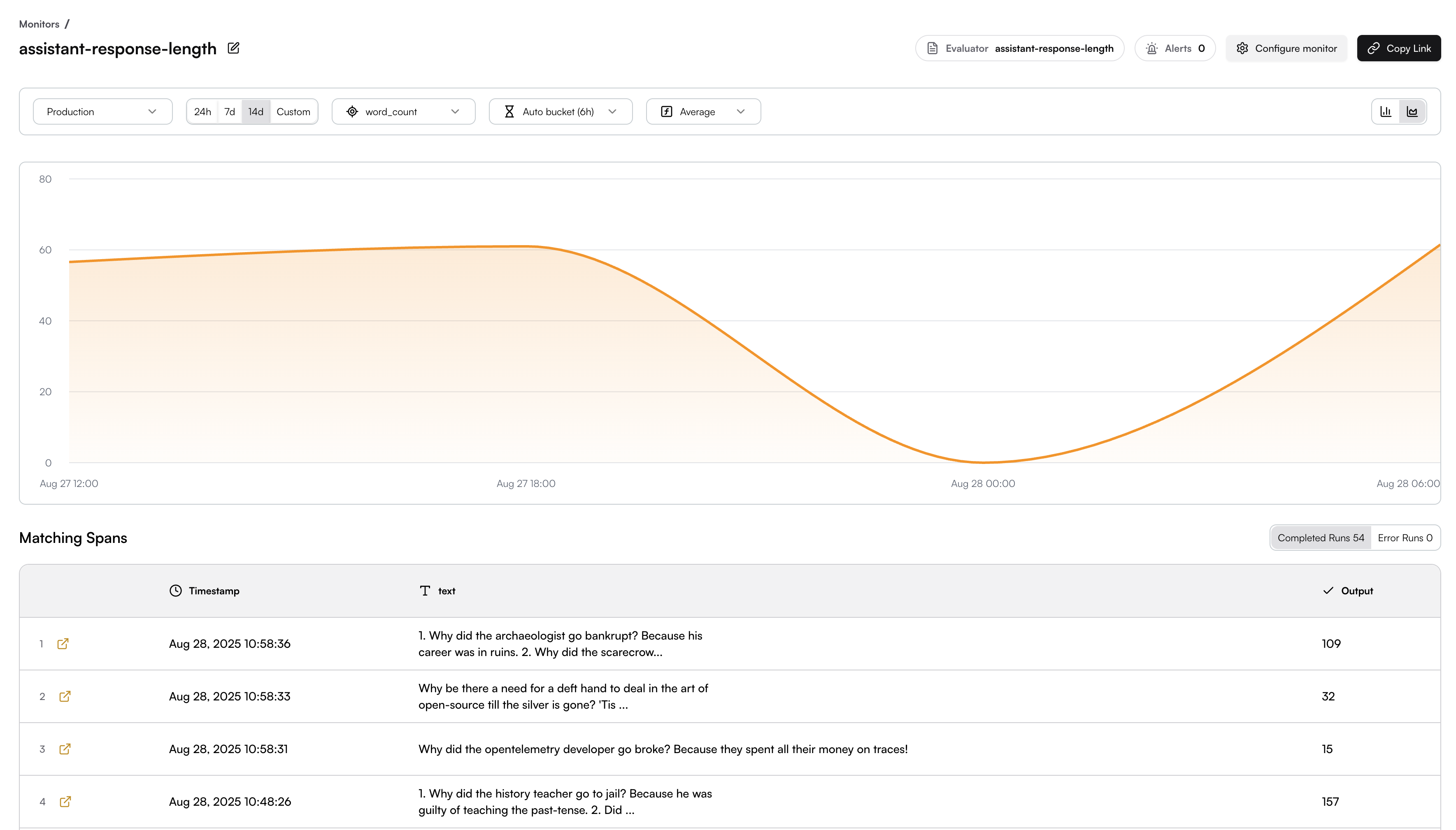 Click on any monitor to access its detailed results page. The monitor page provides comprehensive analytics and span-level details.Chart Visualizations