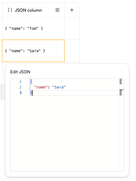 A JSON column allows you to store and edit structured JSON objects directly in the Playground. Each cell can contain a JSON value, making it easy to work with complex data structures. When editing a cell, an Edit JSON panel opens with syntax highlighting and formatting support, so you can quickly add or update fields.