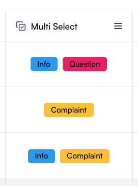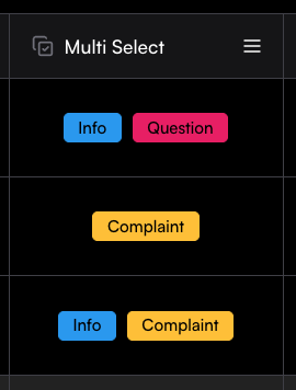 Multi-select columns let you define a set of predefined options and allow each cell to contain multiple selections. The setup process is the same as for single-select columns: define the column name, add options in the Create Column drawer, and save them as labels. In the table, each cell can then include several of the defined options. This column type is especially useful for manual tagging with multiple tags.