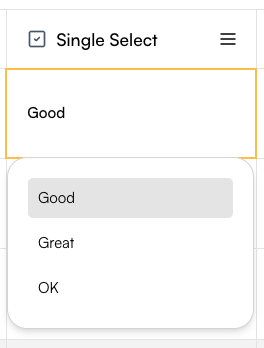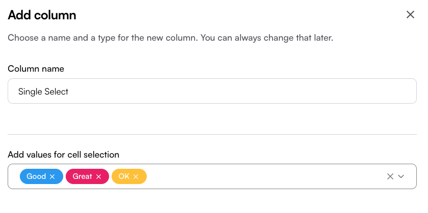 Single-choice columns let you define a set of predefined options and restrict each cell to one selection. To create one, set the column name and add options in the Create Column drawer. In the values box, type an option and press Enter to save itโonce added, it will appear as a colored label. In the table, each cell will then allow you to select only one of the defined options. This column type is especially useful for manual tagging with a single tag.