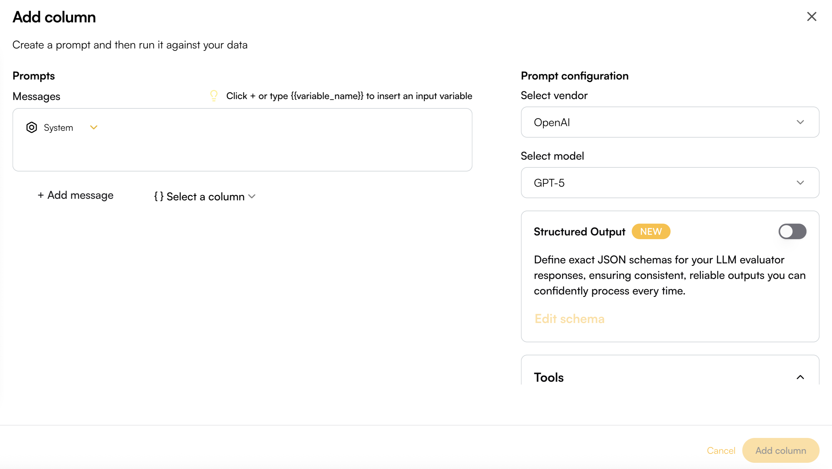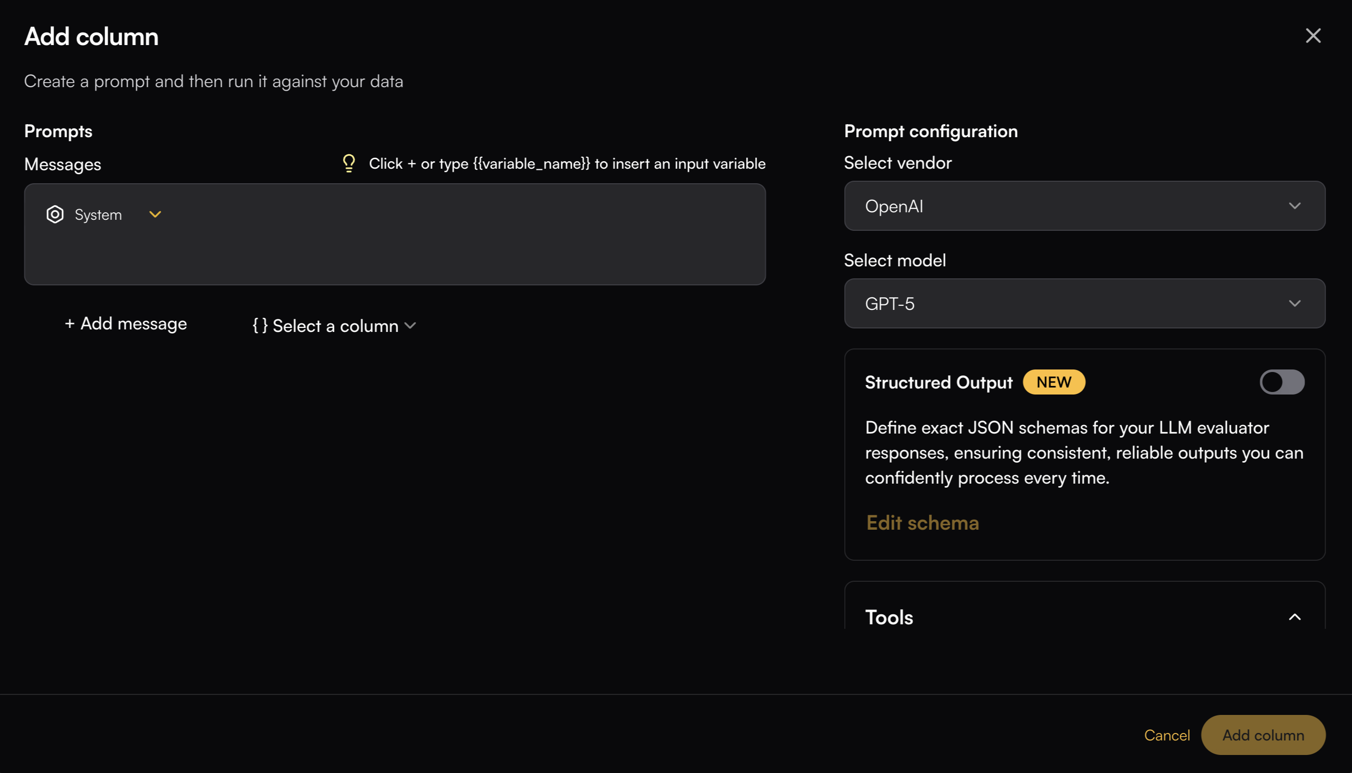 A Prompt column allows you to define a custom prompt and run it directly on your Playground data. You can compose prompts with messages (system, user, assistant or developer), insert playground variables, and configure which model to use. Each row in your playground will be passed through the prompt, and the model’s response will be stored in the column.Prompt columns make it easy to test different prompts against real data, compare model outputs side by side.