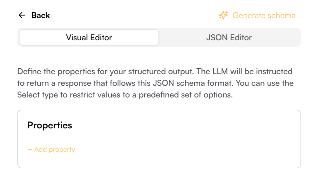 Structured output can be enabled for models that support it. You can define a schema in several ways:- JSON Editor - Write a JSON structure directly in the editor