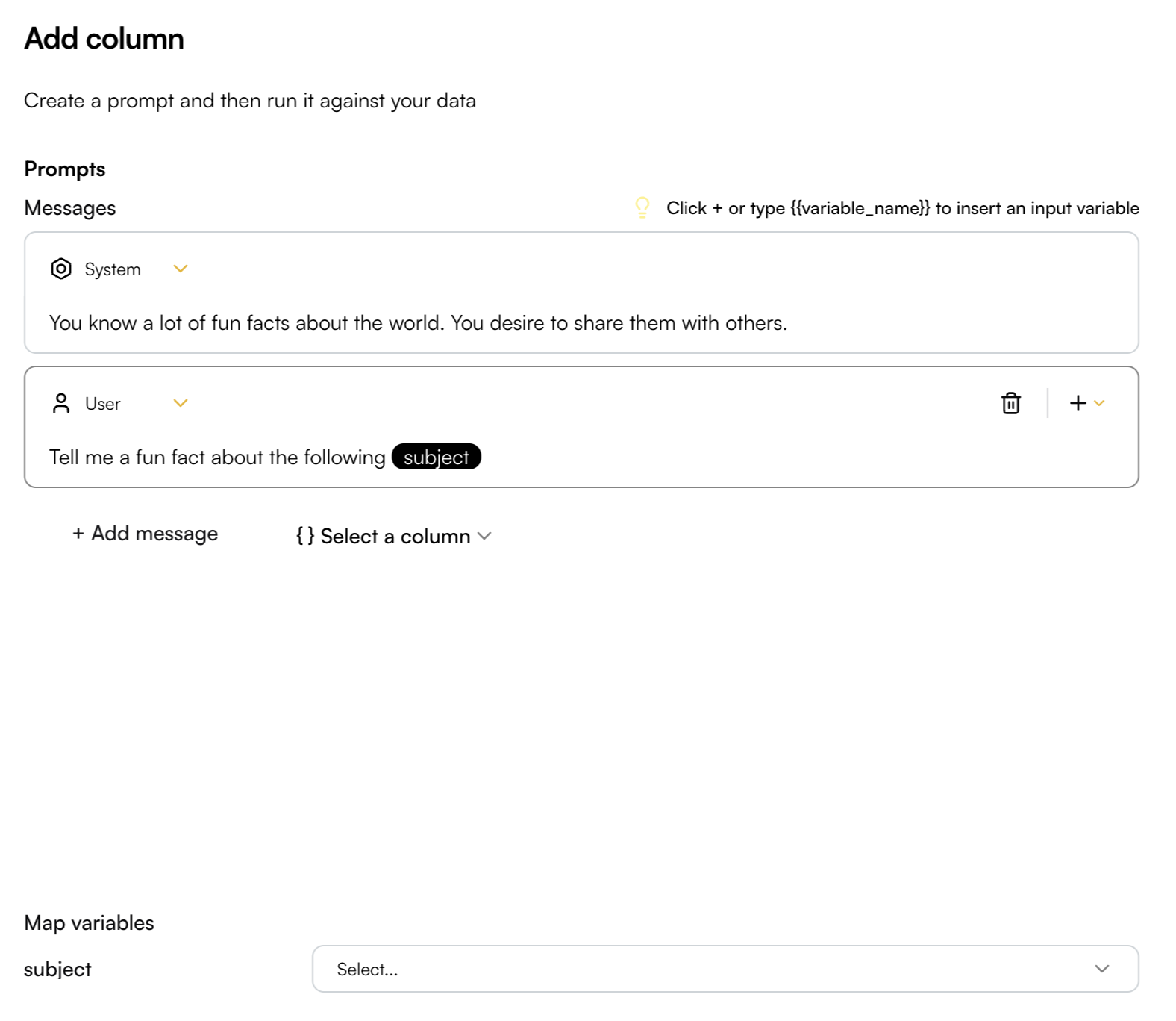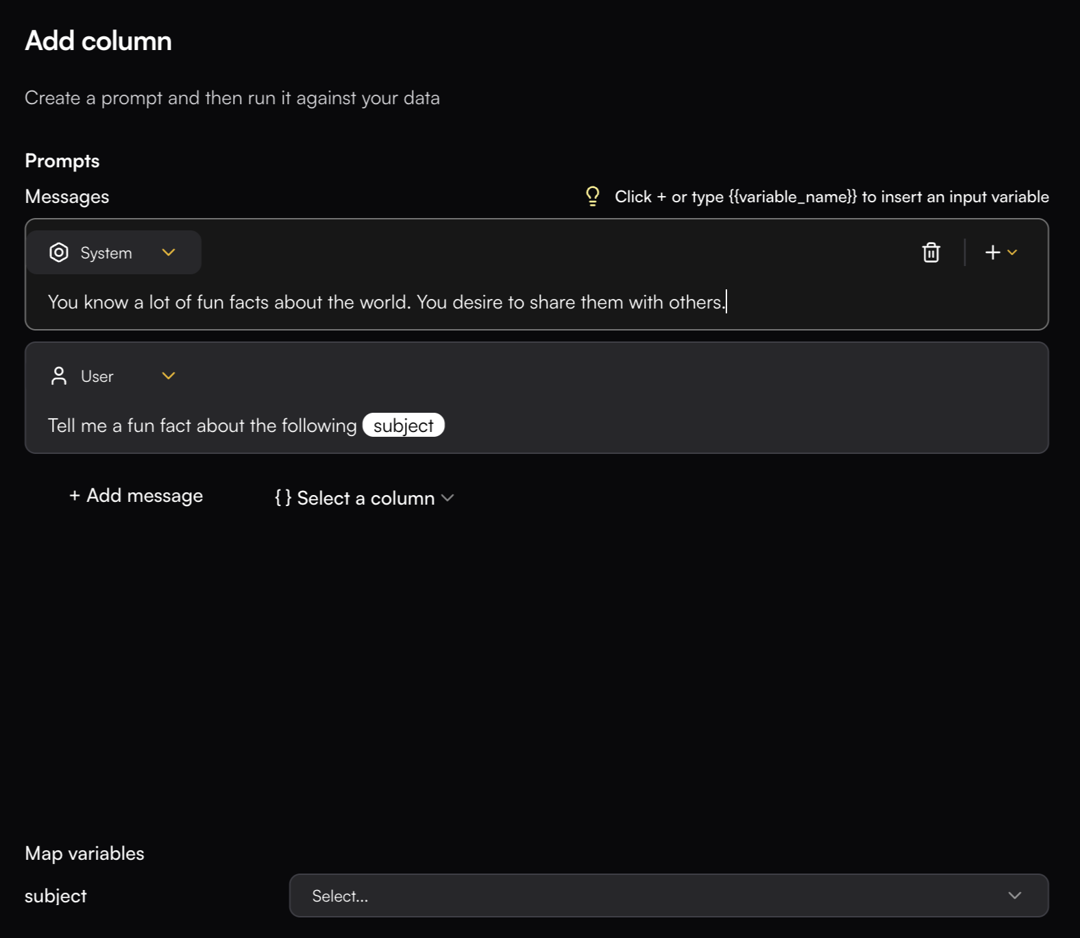 Write your prompt messages by selecting a specific role—System, User, Assistant, or Developer. You can insert variables into the prompt using curly brackets (e.g.,{{variable_name}}) or by adding column valuable with the top right + button in the message box. These variables can then be mapped to existing column data, allowing your prompt to dynamically adapt to the playground