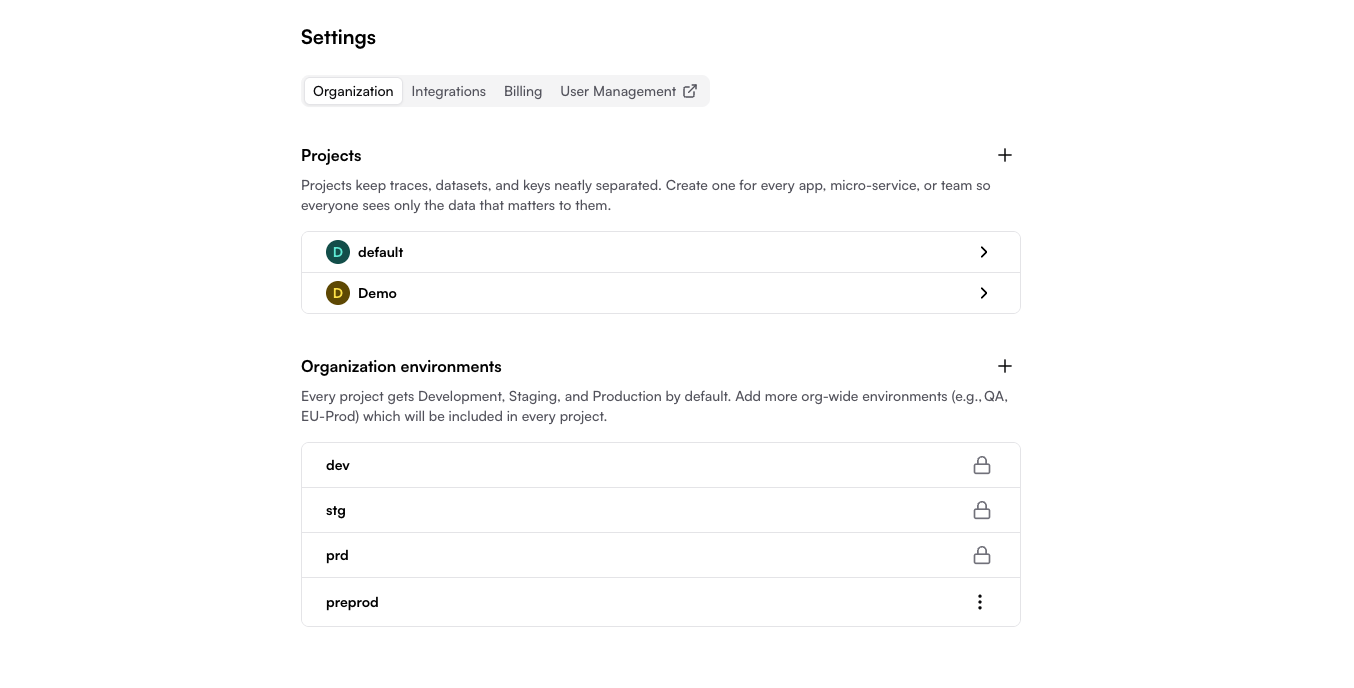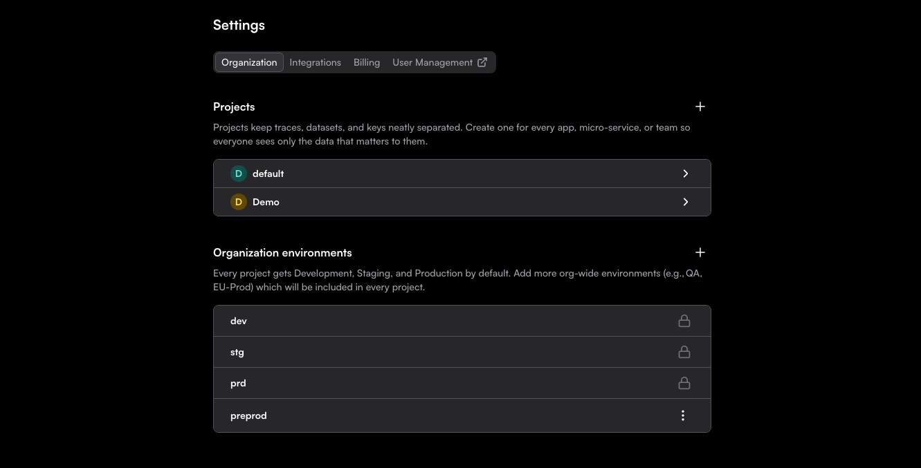 An environment represents a deployment stage within a project. Each environment has its own API key, allowing you to send traces from different stages without mixing the data. Default environments (cannot be deleted):- dev: Local development and testing